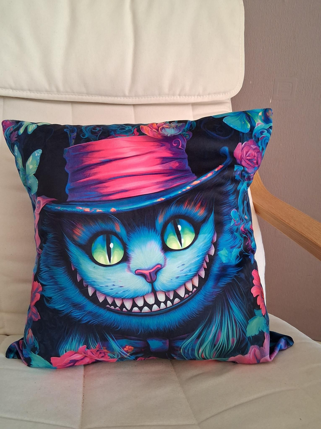 Measuring 18" and crafted from plush French velvet, this cushion showcases a vibrant, whimsical cat design reminiscent of the Cheshire Cat—complete with gleaming green eyes and a cheeky grin. Bold florals and abstract accents frame the feline face, giving it a magical, storybook quality that sparks joy and conversation.