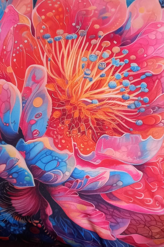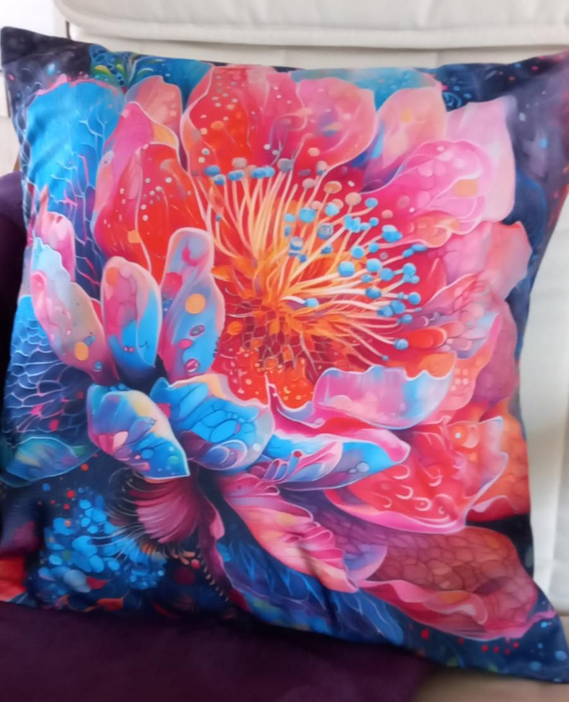 A stunning floral velvet cushion on shades of pinks and blues. 18" and comes complete with the padded cushion insert. The reverse side is an envelope style navy velvet.