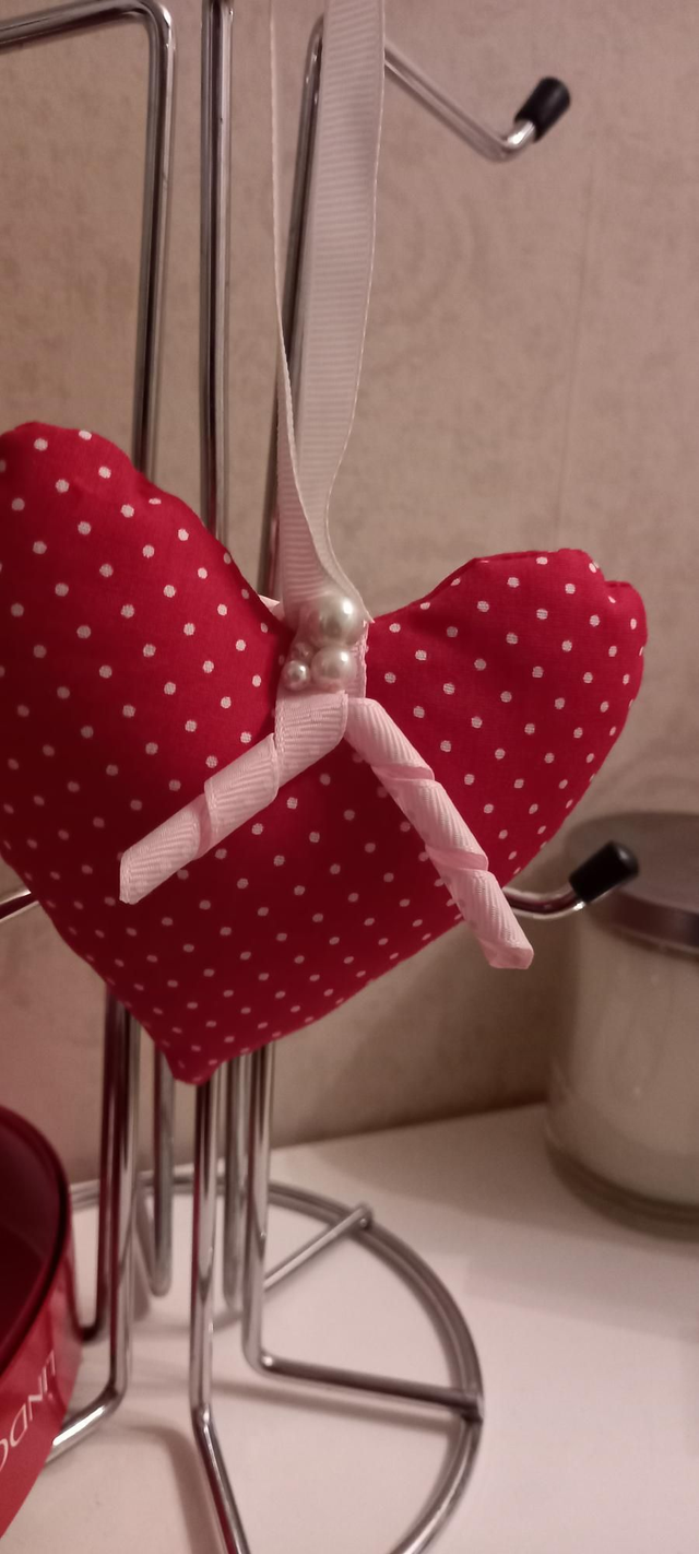 Hang with a ribbon and each one has beads stitched to it. The white ribbon one has pink polkadot curl ribbons and beads on both sides.